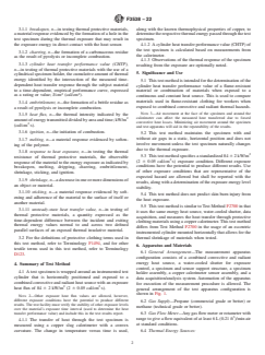 SIGNIFICANCE AND USE 5.1 This test method is intended for the determination of the cylinder heat transfer performance value of a flame-resistant material or combination of materials when exposed to a continuous and constant heat source. This is used to compare materials used in flame-resistant clothing for workers when exposed to combined convective and radiant thermal hazards. Note 3: Air movement at the face of the specimen and around the calorimeter can affect the measured heat transferred due to forced convective heat losses. Minimizing air movement around the specimen and test apparatus will aid in the repeatability of the results. 5.2 This test method maintains the specimen with and without air gaps in a static, horizontal position and does not involve movement unless the test specimen naturally changes due to the thermal exposure. 5.3 This test method specifies a standardized 84 ± 2 kW/m2 (2 ± 0.05 cal/cm2·s) exposure condition. Different exposure conditions have the potential to produce different results. Use of other exposure conditions that are representative of the expected hazard are allowed but shall be reported with the results, along with a determination of the exposure energy level stability. 5.4 This test method does not predict skin burn injury from the heat exposure. 5.5 This test method is similar to Test Method F2700 in that it uses the same energy heat source, water-cooled shutter, data acquisition, and measures the heat transfer through protective clothing materials using a copper calorimeter. This test method differs from Test Method F2700 in the usage of an eccentric instrumented cylinder mounted horizontally that allows for the thermal shrinkage of materials when tested. SCOPE 1.1 This test method measures the thermal response of a material or combination of materials using a combined convective/radiant heat transmission apparatus consisting of an eccentric cylindrical test sensor. It can be used to estimate the non-steady state thermal transfer through flame-resistant materials used in clothing when subjected to a continuous, combined convective and radiant heat exposure. The average incident heat flux is 84 kW/m2 (2 cal/cm2·s), with durations up to 30 s. 1.1.1 This test method is not applicable to materials that melt, drip, or cause falling debris during the test. Note 1: Because of the arrangement of the equipment, if materials melt, drip, or cause falling debris during the test, the test result is invalid. 1.2 Heat transmission through clothing is largely determined by its thickness, including any air gaps. The air gaps can vary considerably in different areas of the human body. This method provides a means of grading materials when tested under standard test conditions and an air gap exists between the fabric and the sensor. During the exposure, fabric temperatures can exceed 400 °C. At these temperatures some fabrics are not dimensionally stable and can shrink or stretch. The cylindrical geometry used in this test method allows such motion to occur, which will affect the time to achieve the end point of the test. These effects are not demonstrated in planar geometry test methods such as Test Method F2700. 1.3 This test method is used to measure and describe the response of materials, products, or assemblies to heat under controlled conditions, but does not by itself incorporate all factors required for fire hazard or fire risk assessment of the materials, products, or assemblies under actual fire conditions. 1.4 The measurements obtained and observations noted only apply to the particular material(s) tested using the specified heat flux, flame distribution, and duration. 1.5 The values stated in SI units are to be regarded as standard. The values given in parentheses are mathematical conversions to inch-pound units or other units commonly used for thermal testing. If appropriate, round the non-SI units for convenience. 1.6 This standard does not p...
