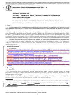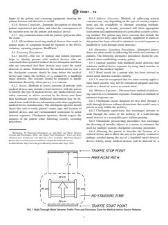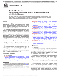 ASTM F2401-16 is a standard published by ASTM International. Its full title is "Standard Practice for Security Checkpoint Metal Detector Screening of Persons with Medical Devices". This standard covers: SIGNIFICANCE AND USE 5.1 This practice is intended to be used as a guide for the design, configuration, and operation of security checkpoints to minimize exposure of ambulatory medical devices to the electromagnetic fields emitted by metal detector security systems. Guidance is presented for signage and information to help identify persons with ambulatory medical devices and process them through the security checkpoint. 5.2 This practice is intended to help in the training of checkpoint screeners to address the concerns of persons with ambulatory medical devices and to respond to their needs. 5.3 This practice is intended to aid the medical community in advising medical device users who may be affected to identify themselves at security checkpoints so their concerns may be addressed. 5.4 This practice is intended to aid medical device manufacturers to provide consistent information for medical device users, patients, and checkpoint screeners. SCOPE 1.1 The following practice is intended to address the needs and concerns of persons with implanted, active, medical devices or active ambulatory medical devices, as well as passive implanted medical devices, while maintaining the integrity of the security checkpoint. 1.2 Active and passive implanted medical devices are being used at an increasing rate as a means to prolong and improve quality of life. Although these medical devices are typically designed to operate in the electromagnetic environment experienced in daily life, there is a potential for the disruption of active medical device function when exposed to certain electromagnetic fields emitted by commonly encountered electrically powered products, including handheld and walk-through metal detectors used in security checkpoint screening. In addition, some active or passive implanted devices may trigger the unintended alarm of the metal detector. 1.3 The values stated in SI units are to be regarded as the standard. The values shown in parentheses are for information only. 1.4 This standard does not purport to address all of the safety concerns, if any, associated with its use. It is the responsibility of the user of this standard to establish appropriate safety and health practices and determine the applicability of regulatory limitations prior to use.