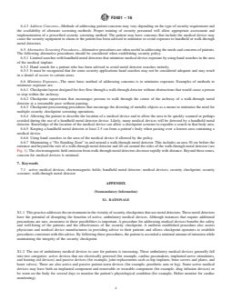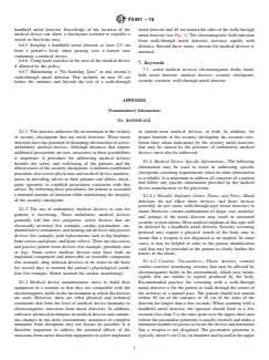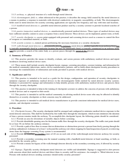 SIGNIFICANCE AND USE 5.1 This practice is intended to be used as a guide for the design, configuration, and operation of security checkpoints to minimize exposure of ambulatory medical devices to the electromagnetic fields emitted by metal detector security systems. Guidance is presented for signage and information to help identify persons with ambulatory medical devices and process them through the security checkpoint. 5.2 This practice is intended to help in the training of checkpoint screeners to address the concerns of persons with ambulatory medical devices and to respond to their needs. 5.3 This practice is intended to aid the medical community in advising medical device users who may be affected to identify themselves at security checkpoints so their concerns may be addressed. 5.4 This practice is intended to aid medical device manufacturers to provide consistent information for medical device users, patients, and checkpoint screeners. SCOPE 1.1 The following practice is intended to address the needs and concerns of persons with implanted, active, medical devices or active ambulatory medical devices, as well as passive implanted medical devices, while maintaining the integrity of the security checkpoint. 1.2 Active and passive implanted medical devices are being used at an increasing rate as a means to prolong and improve quality of life. Although these medical devices are typically designed to operate in the electromagnetic environment experienced in daily life, there is a potential for the disruption of active medical device function when exposed to certain electromagnetic fields emitted by commonly encountered electrically powered products, including handheld and walk-through metal detectors used in security checkpoint screening. In addition, some active or passive implanted devices may trigger the unintended alarm of the metal detector. 1.3 The values stated in SI units are to be regarded as the standard. The values shown in parentheses are for information only. 1.4 This standard does not purport to address all of the safety concerns, if any, associated with its use. It is the responsibility of the user of this standard to establish appropriate safety and health practices and determine the applicability of regulatory limitations prior to use.