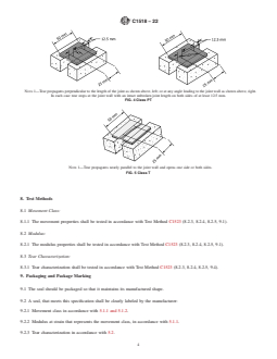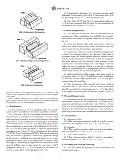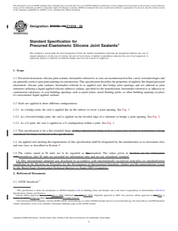 ABSTRACT This specification describes the properties of applied, flat shaped precured elastomeric silicone joint sealants that bridge joint openings and are adhered to joint substrates utilizing a liquid applied silicone adhesive sealant to seal building openings such as panel joints, metal flashing joints, or other building openings in place of conventional liquid applied sealants. Seals are applied in three different configurations, as follows: as a bridge joint, the seal is applied flat on the surface to cover a joint opening; as a beveled bridge joint, the seal is applied on the beveled edge of a substrate to bridge a joint opening.; as a U-joint, the seal is applied in a U-configuration within a joint. Seals are classified into Movement Classes on the basis of movement capability, and Tear Class on the basis of tear propagation. Seals should adhere to specified requirements as to stability, color and texture, application, adhesion and cohesion, and movement, modulus, and tear characteristics. SCOPE 1.1 Precured elastomeric silicone joint sealants, hereinafter referred to as seal, are manufactured in flat, cured, extruded shapes and are primarily used to span joint openings in construction. This specification describes the properties of applied, flat shaped precured elastomeric silicone joint sealants, hereinafter referred to as applied seal, that bridge joint openings and are adhered to joint substrates utilizing a liquid applied silicone adhesive sealant, specified by the manufacturer, hereinafter referred to as adhesive to construction substrates, to seal building openings such as panel joints, metal flashing joints, or other building openings in place of conventional liquid applied sealants. 1.2 Seals are applied in three different configurations: 1.2.1 As a bridge joint, the seal is applied flat on the surface to cover a joint opening. See Fig. 1. FIG. 1 Bridge Joint Configuration 1.2.2 As a beveled bridge joint, the seal is applied on the beveled edge of a substrate to bridge a joint opening. See Fig. 2. FIG. 2 Beveled Bridge Joint Configuration 1.2.3 As a U-joint, the seal is applied in a U-configuration within a joint. See Fig. 3. FIG. 3 U-Joint Configuration 1.3 This specification is for a flat extruded shape. 1.4 An applied seal meeting the requirements of this specification shall be designated by the manufacturer as to movement class and tear class as described in Section 5. 1.5 The values stated in SI units are to be regarded as standard. The values given in parentheses after SI units are provided for information only and are not considered standard. 1.6 This international standard was developed in accordance with internationally recognized principles on standardization established in the Decision on Principles for the Development of International Standards, Guides and Recommendations issued by the World Trade Organization Technical Barriers to Trade (TBT) Committee.