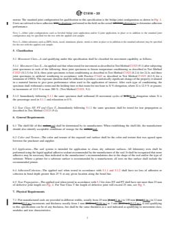 ASTM C1518-22 is a technical specification published by ASTM International. Its full title is "Standard Specification for Precured Elastomeric Silicone Joint Sealants". This standard covers: ABSTRACT This specification describes the properties of applied, flat shaped precured elastomeric silicone joint sealants that bridge joint openings and are adhered to joint substrates utilizing a liquid applied silicone adhesive sealant to seal building openings such as panel joints, metal flashing joints, or other building openings in place of conventional liquid applied sealants. Seals are applied in three different configurations, as follows: as a bridge joint, the seal is applied flat on the surface to cover a joint opening; as a beveled bridge joint, the seal is applied on the beveled edge of a substrate to bridge a joint opening.; as a U-joint, the seal is applied in a U-configuration within a joint. Seals are classified into Movement Classes on the basis of movement capability, and Tear Class on the basis of tear propagation. Seals should adhere to specified requirements as to stability, color and texture, application, adhesion and cohesion, and movement, modulus, and tear characteristics. SCOPE 1.1 Precured elastomeric silicone joint sealants, hereinafter referred to as seal, are manufactured in flat, cured, extruded shapes and are primarily used to span joint openings in construction. This specification describes the properties of applied, flat shaped precured elastomeric silicone joint sealants, hereinafter referred to as applied seal, that bridge joint openings and are adhered to joint substrates utilizing a liquid applied silicone adhesive sealant, specified by the manufacturer, hereinafter referred to as adhesive to construction substrates, to seal building openings such as panel joints, metal flashing joints, or other building openings in place of conventional liquid applied sealants. 1.2 Seals are applied in three different configurations: 1.2.1 As a bridge joint, the seal is applied flat on the surface to cover a joint opening. See Fig. 1. FIG. 1 Bridge Joint Configuration 1.2.2 As a beveled bridge joint, the seal is applied on the beveled edge of a substrate to bridge a joint opening. See Fig. 2. FIG. 2 Beveled Bridge Joint Configuration 1.2.3 As a U-joint, the seal is applied in a U-configuration within a joint. See Fig. 3. FIG. 3 U-Joint Configuration 1.3 This specification is for a flat extruded shape. 1.4 An applied seal meeting the requirements of this specification shall be designated by the manufacturer as to movement class and tear class as described in Section 5. 1.5 The values stated in SI units are to be regarded as standard. The values given in parentheses after SI units are provided for information only and are not considered standard. 1.6 This international standard was developed in accordance with internationally recognized principles on standardization established in the Decision on Principles for the Development of International Standards, Guides and Recommendations issued by the World Trade Organization Technical Barriers to Trade (TBT) Committee.