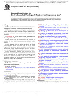 ABSTRACT This specification covers the requirements for electrodeposited rhodium coatings for engineering applications, usually employed for their corrosion resistance, stable electrical contact resistance, wear resistance, reflectivity, and heat resistance. Coating shall be classified based on their thickness. Specimens shall undergo preparatory preplating procedures such as surface cleaning and stress relief treatment, as well as post-plating embrittlement relief process. Coatings shall be sampled, tested, and conform accordingly to specified requirements as to purity, appearance, adhesion, hydrogen embrittlement, reflectivity, and thickness (to be measured either nondestructively by beta backscatter method or X-ray fluorescence, or destructively by microscopical cross sectioning method). SCOPE 1.1 This specification covers requirements for electrodeposited coatings of rhodium used for engineering purposes. 1.2 Coatings of rhodium covered by this specification are usually employed for their corrosion resistance, stable electrical contact resistance, wear resistance, reflectivity, and heat resistance. 1.3 Appendix X1 covers some typical applications for electrodeposited rhodium. 1.4 The values stated in SI units are to be regarded as standard. No other units of measurement are included in this standard. 1.5 This standard does not purport to address all of the safety concerns, if any, associated with its use. It is the responsibility of the user of this standard to establish appropriate safety, health, and environmental practices and determine the applicability of regulatory limitations prior to use. 1.6 This international standard was developed in accordance with internationally recognized principles on standardization established in the Decision on Principles for the Development of International Standards, Guides and Recommendations issued by the World Trade Organization Technical Barriers to Trade (TBT) Committee.