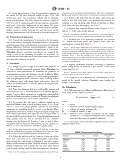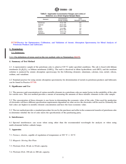 SIGNIFICANCE AND USE 5.1 The presence and concentration of various metallic elements in a petroleum coke are major factors in the suitability of the coke for various uses. This test method provides a means of measuring the amounts of those metallic elements in the coke sample. 5.2 The concentration of these elements is one factor in determining the economic value of the coke. Coke used for production of electrodes will have different specification requirements dependent on what service the electrodes will be used in. Generally the fuel cokes are highest in metallic element concentration and have the least economic value. 5.3 The test method provides a standard procedure for use by the purchaser and seller in the commercial transfer of petroleum coke to determine whether the lot of coke meets the specifications of the purchasing party. SCOPE 1.1 This test method covers the analysis for the commonly determined trace metals (aluminum, calcium, iron, nickel, silicon, sodium, and vanadium) in laboratory analysis samples of raw and calcined petroleum coke by atomic absorption spectroscopy. 1.2 The elemental concentration ranges for which this test method is applicable and the limits of detection of this test method are listed in Table 1. 1.3 The values stated in SI units are to be regarded as the standard. 1.4 This standard does not purport to address all of the safety concerns, if any, associated with its use. It is the responsibility of the user of this standard to establish appropriate safety, health, and environmental practices and determine the applicability of regulatory limitations prior to use. For warning statements, see Sections 9 – 11. 1.5 This international standard was developed in accordance with internationally recognized principles on standardization established in the Decision on Principles for the Development of International Standards, Guides and Recommendations issued by the World Trade Organization Technical Barriers to Trade (TBT) Committee.