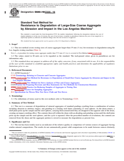 SIGNIFICANCE AND USE 5.1 The test has been widely used as an indicator of the relative quality or competence of various sources of aggregate having similar mineral compositions. The results do not automatically permit valid comparisons to be made between sources distinctly different in origin, composition, or structure. Assign specification limits with extreme care in consideration of available aggregate types and their performance history in specific end uses. SCOPE 1.1 This test method covers testing sizes of coarse aggregate larger than 19 mm (3/4 in.) for resistance to degradation using the Los Angeles testing machine (Note 1). Note 1: A procedure for testing coarse aggregate smaller than 37.5 mm (11/2 in.) is covered in Test Method C131/C131M. 1.2 The values stated in SI units are to be regarded as the standard. The inch-pound values given in parentheses are for information only. 1.3 This standard does not purport to address all of the safety concerns, if any, associated with its use. It is the responsibility of the user of this standard to establish appropriate safety and health practices and determine the applicability of regulatory limitations prior to use.