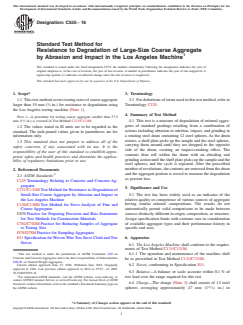 ASTM C535-16 is a standard published by ASTM International. Its full title is "Standard Test Method for Resistance to Degradation of Large-Size Coarse Aggregate by Abrasion and Impact in the Los Angeles Machine". This standard covers: SIGNIFICANCE AND USE 5.1 The test has been widely used as an indicator of the relative quality or competence of various sources of aggregate having similar mineral compositions. The results do not automatically permit valid comparisons to be made between sources distinctly different in origin, composition, or structure. Assign specification limits with extreme care in consideration of available aggregate types and their performance history in specific end uses. SCOPE 1.1 This test method covers testing sizes of coarse aggregate larger than 19 mm (3/4 in.) for resistance to degradation using the Los Angeles testing machine (Note 1). Note 1: A procedure for testing coarse aggregate smaller than 37.5 mm (11/2 in.) is covered in Test Method C131/C131M. 1.2 The values stated in SI units are to be regarded as the standard. The inch-pound values given in parentheses are for information only. 1.3 This standard does not purport to address all of the safety concerns, if any, associated with its use. It is the responsibility of the user of this standard to establish appropriate safety and health practices and determine the applicability of regulatory limitations prior to use.