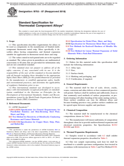 ABSTRACT This specification details the requirements for alloys to be used as components in the manufacture of bonded multi-component thermostat metal strip. It describes alloys having composition, and thermal expansion suitable for application in thermostat metal sheet and strip. The material shall be free of scale, slivers, cracks, seams, corrosion and other defects as best commercial practice will permit. Surfaces shall be uniform and sufficiently clean. Product surface condition can be agreed upon between supplier and purchaser since surface condition can vary for different alloys and because bonding practices vary. The material shall be made of carbon, manganese, silicon, phosphorus, sulfur, chromium, nickel, copper, aluminum, cobalt, and iron. This product shall be supplied in the condition agreed upon by purchaser and seller. Hardness shall be measured on representative samples from each heat treat lot. SCOPE 1.1 This specification describes requirements for alloys to be used as components in the manufacture of bonded multi-component thermostat metal strip. More specifically it describes alloys having composition, and thermal expansion suitable for application in thermostat metal sheet and strip. 1.2 The values stated in inch-pound units are to be regarded as standard. The values given in parentheses are mathematical conversions to SI units that are provided for information only and are not considered standard. 1.3 This standard does not purport to address all of the safety concerns, if any, associated with its use. It is the responsibility of the user of this standard to become familiar with all hazards including those identified in the appropriate Safety Data Sheet (SDS) for this product/material as provided by the manufacturer, to establish appropriate safety, health, and environmental practices, and determine the applicability of regulatory limitations prior to use. 1.4 This international standard was developed in accordance with internationally recognized principles on standardization established in the Decision on Principles for the Development of International Standards, Guides and Recommendations issued by the World Trade Organization Technical Barriers to Trade (TBT) Committee.