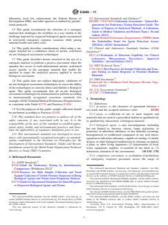 ASTM E3095-17 is a guide published by ASTM International. Its full title is "Standard Guide for Surrogate Materials for Field Evaluation of Nucleic Acid-Based On-Site Biological Assessment Technologies". This standard covers: SIGNIFICANCE AND USE 4.1 This guide provides guidance on how a surrogate material can be selected and inserted into a field workflow for confidence checks and process assessments of on-site biological assessment technologies to demonstrate that the technology is working in the field environment in the hands of operators. 4.2 Use of a surrogate material instead of an inactivated or attenuated biological agent (or its components) is beneficial due to (1) ease of production and handling, (2) ease of acquisition and transportation, (3) the ability to use the material with minimal equipment and facility constraints, for example, biosafety containment, and (4) minimized risk of contamination of personnel, equipment and the environment with a potential biological agent. 4.3 This guide covers the basic design of confidence checks and process assessments that may be used to target (1) the workflow in the field, (2) the performance of the on-site biological assessment technology, and (3) the operator’s ability to process a material in the field workflow, in order to increase confidence in each component. These demonstrations provide emergency responders with insight into routine operation of a nucleic acid-based biological assessment technology and the opportunity to assess and demonstrate their capabilities according to a defined training program in their jurisdiction. 4.4 This guide may be used to aid operators in the routine use of any nucleic acid-based on-site biological assessment technology. Using a surrogate material, operators are able to gain confidence in their ability to perform operations in the workflow and gather routine information (for example, operator performance, assessment results over time) in the field. 4.5 This guide should be used in accordance with Practices E2458 and Guide E2770. 4.6 This guide should be used according to the appropriate risk reduction measures (including personal protective equipment) that are needed for the biosafety level of the surrog... SCOPE 1.1 This guide describes factors to consider when developing, selecting, and using a surrogate material for evaluating the operational performance of nucleic acid-based on-site biological assessment technologies. Operational performance includes the workflow, technology, operator, controls, and result reporting. 1.2 Users of this guide include developers and manufacturers of on-site biological assessment technologies or surrogate materials, as well as the initial responder community and other operators of the technologies. 1.3 This guide recommends the use of surrogate materials to support training; improve the knowledge, skills, and confidence of operators; and enable confidence check and process assessment demonstrations in support of jurisdictional biothreat mission capabilities as recommended in Guide E2770, Section 8. 1.4 This guide recommends the use of surrogate materials in combination with a training program as articulated in Guide E2770 and coordinated among the initial responder organization, hazardous materials response unit, Urban Search and Rescue (US&R) team, National Guard Civil Support Team (CST), Laboratory Response Network (LRN) reference laboratory, local law enforcement, the Federal Bureau of Investigation (FBI), and other agencies as defined by jurisdictional protocols. 1.5 This guide recommends the selection of a surrogate material that challenges the workflow in a way similar to the challenge imposed by suspected biological agents encountered in real-world emergency response scenarios while posing minimal health and safety risks. 1.6 This guide describes considerations when using a surrogate material for a confidence check of nucleic acid-based on-site biological assessment technologies. 1.7 This guide describes factors involved in the use of a surrogate material to perform a process assessment when the operator has access to well-characterized nucleic acid-based assays specific ...