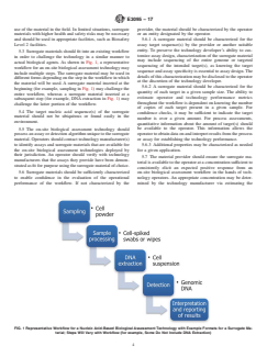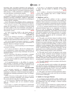 SIGNIFICANCE AND USE 4.1 This guide provides guidance on how a surrogate material can be selected and inserted into a field workflow for confidence checks and process assessments of on-site biological assessment technologies to demonstrate that the technology is working in the field environment in the hands of operators. 4.2 Use of a surrogate material instead of an inactivated or attenuated biological agent (or its components) is beneficial due to (1) ease of production and handling, (2) ease of acquisition and transportation, (3) the ability to use the material with minimal equipment and facility constraints, for example, biosafety containment, and (4) minimized risk of contamination of personnel, equipment and the environment with a potential biological agent. 4.3 This guide covers the basic design of confidence checks and process assessments that may be used to target (1) the workflow in the field, (2) the performance of the on-site biological assessment technology, and (3) the operator’s ability to process a material in the field workflow, in order to increase confidence in each component. These demonstrations provide emergency responders with insight into routine operation of a nucleic acid-based biological assessment technology and the opportunity to assess and demonstrate their capabilities according to a defined training program in their jurisdiction. 4.4 This guide may be used to aid operators in the routine use of any nucleic acid-based on-site biological assessment technology. Using a surrogate material, operators are able to gain confidence in their ability to perform operations in the workflow and gather routine information (for example, operator performance, assessment results over time) in the field. 4.5 This guide should be used in accordance with Practices E2458 and Guide E2770. 4.6 This guide should be used according to the appropriate risk reduction measures (including personal protective equipment) that are needed for the biosafety level of the surrog... SCOPE 1.1 This guide describes factors to consider when developing, selecting, and using a surrogate material for evaluating the operational performance of nucleic acid-based on-site biological assessment technologies. Operational performance includes the workflow, technology, operator, controls, and result reporting. 1.2 Users of this guide include developers and manufacturers of on-site biological assessment technologies or surrogate materials, as well as the initial responder community and other operators of the technologies. 1.3 This guide recommends the use of surrogate materials to support training; improve the knowledge, skills, and confidence of operators; and enable confidence check and process assessment demonstrations in support of jurisdictional biothreat mission capabilities as recommended in Guide E2770, Section 8. 1.4 This guide recommends the use of surrogate materials in combination with a training program as articulated in Guide E2770 and coordinated among the initial responder organization, hazardous materials response unit, Urban Search and Rescue (US&R) team, National Guard Civil Support Team (CST), Laboratory Response Network (LRN) reference laboratory, local law enforcement, the Federal Bureau of Investigation (FBI), and other agencies as defined by jurisdictional protocols. 1.5 This guide recommends the selection of a surrogate material that challenges the workflow in a way similar to the challenge imposed by suspected biological agents encountered in real-world emergency response scenarios while posing minimal health and safety risks. 1.6 This guide describes considerations when using a surrogate material for a confidence check of nucleic acid-based on-site biological assessment technologies. 1.7 This guide describes factors involved in the use of a surrogate material to perform a process assessment when the operator has access to well-characterized nucleic acid-based assays specific ...