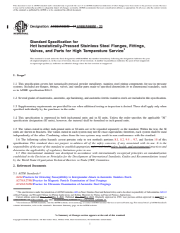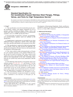 ASTM A988/A988M-23 is a technical specification published by ASTM International. Its full title is "Standard Specification for Hot Isostatically-Pressed Stainless Steel Flanges, Fittings, Valves, and Parts for High Temperature Service". This standard covers: ABSTRACT This specification covers hot isostatically-pressed, powder metallurgy, stainless steel piping components such as flanges, fittings, valves, and similar parts, for use in pressure systems and temperature service applications. The specification includes several grades of martensitic, austenitic, age hardening, and austenitic-ferritic stainless steels. Compacts shall be manufactured by placing a single powder blend into a can, evacuating the can, and sealing it. The powder shall be prealloyed and made by a melting method (such as but not limited to air or vacuum induction melting, followed by gas atomization) to produce the specified chemical composition for carbon, manganese, phosphorus, sulfur, nickel, chromium, molybdenum, columbium, tantalum, copper, tungsten, and nitrogen. Other manufacturing requirements including compact homogeneity, microstructure, and can material removal are given. Heat treatment requirements, such as austenitizing or solutioning, cooling, quenching, tempering, and ageing, and structural integrity requirements, such as density, hydrostatic tests, and ultrasonic tests are detailed as well. Mechanical properties include tensile strength, yield strength, elongation, and hardness. Product analysis shall conform to the chemical requirements. SCOPE 1.1 This specification covers hot isostatically-pressed, powder metallurgy, stainless steel piping components for use in pressure systems. Included are flanges, fittings, valves, and similar parts made to specified dimensions or to dimensional standards, such as in ASME specification B16.5. 1.2 Several grades of martensitic, austenitic, age hardening, and austenitic-ferritic stainless steels are included in this specification. 1.3 Supplementary requirements are provided for use when additional testing or inspection is desired. These shall apply only when specified individually by the purchaser in the order. 1.4 This specification is expressed in both inch-pound units and in SI units. Unless the order specifies the applicable “M” specification designation (SI units), however, the material shall be furnished to inch-pound units. 1.5 The values stated in either inch-pound units or SI units are to be regarded separately as the standard. Within the text, the SI units are shown in brackets. The values stated in each system may not be exact equivalents; therefore, each system shall be used independently of the other. Combining values from the two systems may result in non-conformance with the standard. 1.6 The following safety hazards caveat pertains only to test methods portions 8.1, 8.2, 9.5 – 9.7, and Section 10 of this specification: This standard does not purport to address all of the safety concerns, if any, associated with its use. It is the responsibility of the user of this standard to establish appropriate safety, health, and environmental practices and determine the applicability of regulatory limitations prior to use. 1.7 This international standard was developed in accordance with internationally recognized principles on standardization established in the Decision on Principles for the Development of International Standards, Guides and Recommendations issued by the World Trade Organization Technical Barriers to Trade (TBT) Committee.