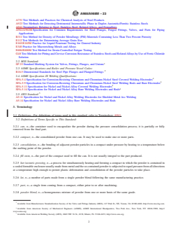 ABSTRACT This specification covers hot isostatically-pressed, powder metallurgy, stainless steel piping components such as flanges, fittings, valves, and similar parts, for use in pressure systems and temperature service applications. The specification includes several grades of martensitic, austenitic, age hardening, and austenitic-ferritic stainless steels. Compacts shall be manufactured by placing a single powder blend into a can, evacuating the can, and sealing it. The powder shall be prealloyed and made by a melting method (such as but not limited to air or vacuum induction melting, followed by gas atomization) to produce the specified chemical composition for carbon, manganese, phosphorus, sulfur, nickel, chromium, molybdenum, columbium, tantalum, copper, tungsten, and nitrogen. Other manufacturing requirements including compact homogeneity, microstructure, and can material removal are given. Heat treatment requirements, such as austenitizing or solutioning, cooling, quenching, tempering, and ageing, and structural integrity requirements, such as density, hydrostatic tests, and ultrasonic tests are detailed as well. Mechanical properties include tensile strength, yield strength, elongation, and hardness. Product analysis shall conform to the chemical requirements. SCOPE 1.1 This specification covers hot isostatically-pressed, powder metallurgy, stainless steel piping components for use in pressure systems. Included are flanges, fittings, valves, and similar parts made to specified dimensions or to dimensional standards, such as in ASME specification B16.5. 1.2 Several grades of martensitic, austenitic, age hardening, and austenitic-ferritic stainless steels are included in this specification. 1.3 Supplementary requirements are provided for use when additional testing or inspection is desired. These shall apply only when specified individually by the purchaser in the order. 1.4 This specification is expressed in both inch-pound units and in SI units. Unless the order specifies the applicable “M” specification designation (SI units), however, the material shall be furnished to inch-pound units. 1.5 The values stated in either inch-pound units or SI units are to be regarded separately as the standard. Within the text, the SI units are shown in brackets. The values stated in each system may not be exact equivalents; therefore, each system shall be used independently of the other. Combining values from the two systems may result in non-conformance with the standard. 1.6 The following safety hazards caveat pertains only to test methods portions 8.1, 8.2, 9.5 – 9.7, and Section 10 of this specification: This standard does not purport to address all of the safety concerns, if any, associated with its use. It is the responsibility of the user of this standard to establish appropriate safety, health, and environmental practices and determine the applicability of regulatory limitations prior to use. 1.7 This international standard was developed in accordance with internationally recognized principles on standardization established in the Decision on Principles for the Development of International Standards, Guides and Recommendations issued by the World Trade Organization Technical Barriers to Trade (TBT) Committee.