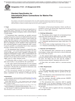 ASTM F1121-87(2019) is a technical specification published by ASTM International. Its full title is "Standard Specification for International Shore Connections for Marine Fire Applications". This standard covers: ABSTRACT This specification covers the design and manufacture of international shore connections to be used with marine fire fighting systems during an emergency when a stricken ship has a system failure. International shore connections are portable universal couplings that permit connection of shipboard fire main systems between one ship and another or between a shore facility and a ship when their respective system threading is mismatched. Both the ship and the facility are expected to have a fitting such that in an emergency can be attached to their respective fire hose and bolted together to permit charging the ship's system. It must be portable to accommodate hose to hose connection and allow assistance from any position. The international shore connection may be machined from forgings, castings, plate or bar stock, or may be fabricated out of more than one piece. The material shall be brass, bronze, or other suitable corrosion-resistant material. When fabricated out of more than one piece, the flange may be steel and the coupling a corrosion-resistant material. Nuts, bolts, and washers shall be a corrosion-resistant material. SCOPE 1.1 This specification covers the design and manufacture of international shore connections to be used with marine fire fighting systems during an emergency when a stricken ship has a system failure. 1.2 International shore connections are portable universal couplings that permit connection of shipboard firemain systems between one ship and another or between a shore facility and a ship when their respective system threading is mismatched. Both the ship and the facility are expected to have a fitting such that in an emergency can be attached to their respective fire hose and bolted together to permit charging the ship's system. It must be portable to accommodate hose to hose connection and allow assistance from any position. 1.3 The international shore connection is required by international treaty2,3 to be carried onboard all passenger and cargo vessels of 500 gross tons or more, regardless of firemain size, engaged in international voyages, and is recommended for all vessels that would be expected to render assistance. It is also intended to be provided at shore facilities that would be used to supply water to a ship’s firemain system. 1.4 Fabrication either on board a vessel, in a shipyard, or other shore facility is not precluded by this specification. 1.5 The values stated in inch-pound units are to be regarded as standard. The values given in parentheses are mathematical conversions to SI units that are provided for information only and are not considered standard. 1.6 This international standard was developed in accordance with internationally recognized principles on standardization established in the Decision on Principles for the Development of International Standards, Guides and Recommendations issued by the World Trade Organization Technical Barriers to Trade (TBT) Committee.