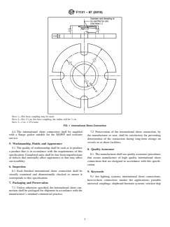 ABSTRACT This specification covers the design and manufacture of international shore connections to be used with marine fire fighting systems during an emergency when a stricken ship has a system failure. International shore connections are portable universal couplings that permit connection of shipboard fire main systems between one ship and another or between a shore facility and a ship when their respective system threading is mismatched. Both the ship and the facility are expected to have a fitting such that in an emergency can be attached to their respective fire hose and bolted together to permit charging the ship's system. It must be portable to accommodate hose to hose connection and allow assistance from any position. The international shore connection may be machined from forgings, castings, plate or bar stock, or may be fabricated out of more than one piece. The material shall be brass, bronze, or other suitable corrosion-resistant material. When fabricated out of more than one piece, the flange may be steel and the coupling a corrosion-resistant material. Nuts, bolts, and washers shall be a corrosion-resistant material. SCOPE 1.1 This specification covers the design and manufacture of international shore connections to be used with marine fire fighting systems during an emergency when a stricken ship has a system failure. 1.2 International shore connections are portable universal couplings that permit connection of shipboard firemain systems between one ship and another or between a shore facility and a ship when their respective system threading is mismatched. Both the ship and the facility are expected to have a fitting such that in an emergency can be attached to their respective fire hose and bolted together to permit charging the ship's system. It must be portable to accommodate hose to hose connection and allow assistance from any position. 1.3 The international shore connection is required by international treaty2,3 to be carried onboard all passenger and cargo vessels of 500 gross tons or more, regardless of firemain size, engaged in international voyages, and is recommended for all vessels that would be expected to render assistance. It is also intended to be provided at shore facilities that would be used to supply water to a ship’s firemain system. 1.4 Fabrication either on board a vessel, in a shipyard, or other shore facility is not precluded by this specification. 1.5 The values stated in inch-pound units are to be regarded as standard. The values given in parentheses are mathematical conversions to SI units that are provided for information only and are not considered standard. 1.6 This international standard was developed in accordance with internationally recognized principles on standardization established in the Decision on Principles for the Development of International Standards, Guides and Recommendations issued by the World Trade Organization Technical Barriers to Trade (TBT) Committee.
