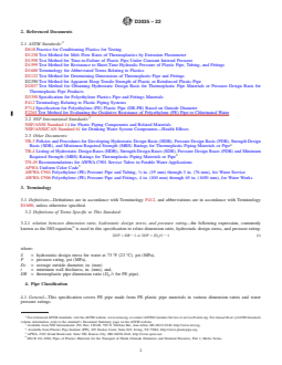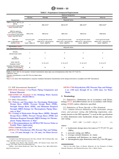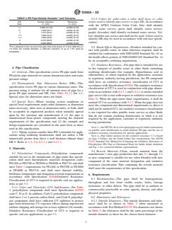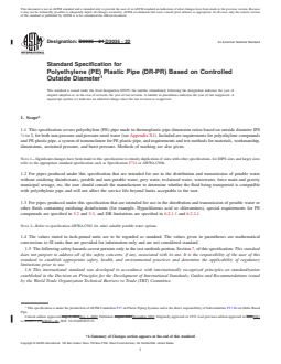 ABSTRACT This specification covers polyethylene (PE) pipes made in thermoplastic pipe dimension ratios based on outside diameter, and pressure rated for water. All pipes produced under this specification may be used for the transport of water, industrial process liquids, effluents, slurries, municipal sewage, etc. Included are criteria for classifying PE plastic pipe materials and PE plastic pipe, and a system of nomenclature for PE plastic pipe. PE pipes shall be evaluated by the test procedures given herein, and shall conform to specified requirements for workmanship, dimensions, sustained pressure at ambient and elevated temperatures, hydrostatic burst pressure, tensile strength at yield, and environmental stress cracking. SCOPE 1.1 This specification covers polyethylene (PE) pipe made in thermoplastic pipe dimension ratios based on outside diameter IPS 1/2 to 3, for both non-pressure and pressure rated water (see Appendix X1). Included are requirements for polyethylene compounds and PE plastic pipe, a system of nomenclature for PE plastic pipe, and requirements and test methods for materials, workmanship, dimensions, sustained pressure, and burst pressure. Methods of marking are also given. Note 1: Significant changes have been made to this specification to remedy duplication of sizes with other specifications, for DIPS sizes and larger sizes refer to the appropriate standard specification such as Specification F714 or AWWA C906. 1.2 For pipes produced under this specification that are intended for use in the distribution and transmission of potable water without oxidizing disinfectants, potable and non-potable water, grey water, reclaimed water, wastewater, force main and gravity municipal sewage, etc, the user should consult the manufacturer to determine whether the fluid being transported is compatible with polyethylene pipe and will not affect the service life beyond limits acceptable to the user. 1.3 For pipes produced under this specification that are intended for use in the distribution and transmission of potable water or other fluids containing oxidizing disinfectants (for example, Hypochlorous acid or chloramines), special requirements for PE compounds are specified in 5.2 and 5.3, and DR limitations are specified in 6.2.1.1 and 6.2.2.1. Note 2: Refer to specification AWWA C901 for other suitable potable water options. 1.4 The values stated in inch-pound units are to be regarded as standard. The values given in parentheses are mathematical conversions to SI units that are provided for information only and are not considered standard. 1.5 The following safety hazards caveat pertains only to the test methods portion, Section 7, of this specification: This standard does not purport to address all of the safety concerns, if any, associated with its use. It is the responsibility of the user of this standard to establish appropriate safety, health, and environmental practices and determine the applicability of regulatory limitations prior to use. 1.6 This international standard was developed in accordance with internationally recognized principles on standardization established in the Decision on Principles for the Development of International Standards, Guides and Recommendations issued by the World Trade Organization Technical Barriers to Trade (TBT) Committee.