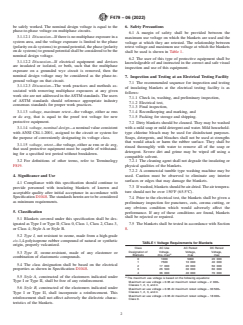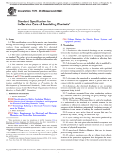 ASTM F479-06(2022) is a technical specification published by ASTM International. Its full title is "Standard Specification for In-Service Care of Insulating Blankets". This standard covers: ABSTRACT This specification covers elastomeric seals (gaskets) used to seal the joints of plastic pipe used for gravity, low-pressure, and high-pressure applications. This refers to push-on joints which require no internal or external pressure to effect the initial seal. Tensile strength, elongation, hardness, compression set, accelerated aging, water immersion, ozone resistance, and force decay shall be tested to meet the requirements prescribed.This specification covers the in-service care, inspection, testing, and use voltage of insulating blankets for protection of workers from accidental contact with live electrical conductors, apparatus, or circuits. Blankets covered shall be designated as type I or type II; class 0, class 1, class 2, class 3, or class 4; style A or style B: type I - not resistant to ozone, made from a high-grade cis-1,4-polyisoprene rubber compound of natural or synthetic origin, properly vulcanized; and type II - ozone-resistant, made of any elastomer or combination of elastomeric compounds. Style A - constructed of the elastomers indicated under type I or type II, shall be free of any reinforcement; and style B - constructed of the elastomers indicated under type I or type II, shall incorporate a reinforcement. Electrical testing shall be performed to meet the requirements prescribed. SCOPE 1.1 This specification covers the in-service care, inspection, testing, and use voltage of insulating blankets for protection of workers from accidental contact with live electrical conductors, apparatus, or circuits. The product requirements and acceptance testing are as shown in Specification D1048. 1.2 The values stated in inch-pound units are to be regarded as standard. The values given in parentheses are mathematical conversions to SI units that are provided for information only and are not considered standard. 1.3 This standard does not purport to address all of the safety concerns, if any, associated with its use. It is the responsibility of the user of this standard to establish appropriate safety, health, and environmental practices and determine the applicability of regulatory limitations prior to use.See Section 6 and 8.2 for specific precautionary statements. 1.4 This international standard was developed in accordance with internationally recognized principles on standardization established in the Decision on Principles for the Development of International Standards, Guides and Recommendations issued by the World Trade Organization Technical Barriers to Trade (TBT) Committee.