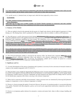 SIGNIFICANCE AND USE 5.1 Accurate determination of the gravity of petroleum and its products is necessary for the conversion of measured volumes to volumes at the standard temperature of 60 °F (15.56 °C). 5.2 This procedure is most suitable for determining the API gravity of low viscosity transparent liquids. This test method can also be used for viscous liquids by allowing sufficient time for the hydrometer to reach temperature equilibrium, and for opaque liquids by employing a suitable meniscus correction. Additionally for both transparent and opaque fluids the readings shall be corrected for the thermal glass expansion effect before correcting to the reference temperature. 5.3 When used in connection with bulk oil measurements, volume correction errors are minimized by observing the hydrometer reading at a temperature as close to reference temperature as feasible. 5.4 Gravity is a factor governing the quality of crude oils. However, the gravity of a petroleum product is an uncertain indication of its quality. Correlated with other properties, gravity can be used to give approximate hydrocarbon composition and heat of combustion. 5.5 Gravity is an important quality indicator for automotive, aviation and marine fuels, where it affects storage, handling and combustion. SCOPE 1.1 This test method covers the determination by means of a glass hydrometer in conjunction with a series of calculations of the API gravity of crude petroleum and petroleum products normally handled as liquids and having a Reid vapor pressure (Test Method D323) of 14.696 psi (101.325 kPa) or less. Values are determined at existing temperatures and corrected to values at 60 °F (15.56 °C), or converted to values at 60 °F, by means of Adjunct to D1250 Standard Guide for the Use of the Joint API and ASTM Adjunct for Temperature and Pressure Volume Correction Factors for Generalized Crude Oils, Refined Products, and Lubricating Oils (API MPMS Chapter 11.1). These tables are not applicable to nonhydrocarbons or essentially pure hydrocarbons such as the aromatics. 1.2 The initial values obtained are uncorrected hydrometer readings and not density measurements. Values are measured on a hydrometer at either the reference temperature or at another convenient temperature, and readings are corrected for the meniscus effect, the thermal glass expansion effect, alternate calibration temperature effects and to the reference temperature by means of the petroleum measurement tables; values obtained at other than the reference temperature being hydrometer readings and not density measurements. 1.3 The initial hydrometer readings determined shall be recorded before performing any calculations. Then the calculations required in Section 9 shall be performed and documented before using the final result in a subsequent calculation procedure (measurement ticket calculation, meter factor calculation, or base prover volume determination). 1.4 The values stated in inch-pound units are to be regarded as standard. The values given in parentheses are mathematical conversions to SI units that are provided for information only and are not considered standard. 1.5 This standard does not purport to address all of the safety concerns, if any, associated with its use. It is the responsibility of the user of this standard to establish appropriate safety, health, and environmental practices and determine the applicability of regulatory limitations prior to use. For specific warning statement, see 8.5. 1.6 This international standard was developed in accordance with internationally recognized principles on standardization established in the Decision on Principles for the Development of International Standards, Guides and Recommendations issued by the World Trade Organization Technical Barriers to Trade (TBT) Committee.