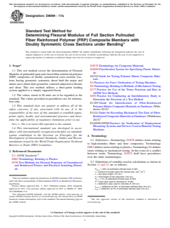 SIGNIFICANCE AND USE 5.1 Determination of flexural modulus by this test method is especially useful for quality control and specification purposes. 5.2 Experimental values for flexural modulus will vary with specimen depth, span length, loading rate, ambient test temperature, and other atmospheric conditions. 5.3 Before proceeding with this test method, reference should be made to the specification of the material being tested, including constituent materials of the specimen. Any test specimen preparation, environmental or loading conditioning, dimensions, or testing parameters covered in the material specification, or both, shall take precedence over those mentioned in this test method. If there are no material specifications, then these default conditions apply. Table 1 in Classification D4000 lists the ASTM materials standards that currently exist. SCOPE 1.1 This test method covers the determination of Flexural Modulus of pultruded open and closed fiber reinforced polymer (FRP) composites of doubly symmetrical cross sections (sections having geometric symmetry about both the major and minor axes) about their geometric centroid subjected to flexure and shear. This test method utilizes a three-point loading system applied to a simply supported beam. 1.2 The values stated in SI units are to be regarded as the standard. The values provided in parentheses are for information only. 1.3 This standard does not purport to address all of the safety concerns, if any, associated with its use. It is the responsibility of the user of this standard to establish appropriate safety, health, and environmental practices and determine the applicability of regulatory limitations prior to use. Note 1: The is no known ISO equivalent to this standard. 1.4 This international standard was developed in accordance with internationally recognized principles on standardization established in the Decision on Principles for the Development of International Standards, Guides and Recommendations issued by the World Trade Organization Technical Barriers to Trade (TBT) Committee.