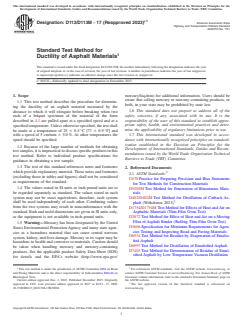 ASTM D113/D113M-17(2023)e1 - Standard Test Method for Ductility of Asphalt Materials is an internationally recognized standard published by ASTM International. This test method specifies the procedure for determining the ductility of asphalt materials, measured by the distance a briquet specimen can elongate before breaking under controlled conditions. Ductility is a key measure of the tensile properties of asphalt and is commonly used for quality control and specification compliance in road and paving construction.