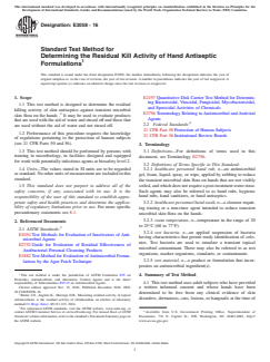 ASTM E3058-16 is a standard published by ASTM International. Its full title is "Standard Test Method for Determining the Residual Kill Activity of Hand Antiseptic Formulations". This standard covers: SIGNIFICANCE AND USE 5.1 Many marketed hand antiseptics make claims of "long-lasting protection” or “extended kill” (for example 6 hours), which are typically based on results of testing as described in Test Method E1882 or Guide E2752, or both. At this time there are no standard methods for evaluating a hand antiseptic formulation for its ability to kill microorganisms on hands when a “dry” contamination event occurs at some time after product use. This test method provides a method to substantiate residual kill claims for hand antiseptics. SCOPE 1.1 This test method is designed to determine the residual killing activity of skin antiseptics against transient microbial skin flora on the hands .2 It may be used to evaluate products that are used with the aid of water and rinsed off and those that are used without the aid of water and not rinsed off. 1.2 Performance of this procedure requires the knowledge of regulations pertaining to the protection of human subjects (see 21 CFR Parts 50 and 56). 1.3 This test method should be performed by persons with training in microbiology, in facilities designed and equipped for work with potentially infectious agents at biosafety level 2. 1.4 Units—The values stated in SI units are to be regarded as standard. No other units of measurement are included in this standard. 1.5 This standard does not purport to address all of the safety concerns, if any, associated with its use. It is the responsibility of the user of this standard to establish appropriate safety and health practices and determine the applicability of regulatory limitations prior to use. For more specific precautionary statements see 8.1.