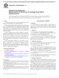 ASTM D7635/D7635M-18 is a standard published by ASTM International. Its full title is "Standard Test Method for Measurement of Thickness of Coatings Over Fabric Reinforcement". This standard covers: SCOPE 1.1 This test method covers measuring the thickness of the coating over fiber backing or reinforcing fabric. 1.2 The values stated in either SI units or inch-pound units are to be regarded separately as standard. The values stated in each system may not be exact equivalents; therefore, each system shall be used independently of the other. Combining values from the two systems may result in non-conformance with the standard. 1.3 This standard may involve hazardous materials, operations, and equipment. This standard does not purport to address all of the safety concerns, if any, associated with its use. It is the responsibility of the user of this standard to establish appropriate safety, health, and environmental practices and determine the applicability of regulatory limitations prior to use. 1.4 This international standard was developed in accordance with internationally recognized principles on standardization established in the Decision on Principles for the Development of International Standards, Guides and Recommendations issued by the World Trade Organization Technical Barriers to Trade (TBT) Committee.