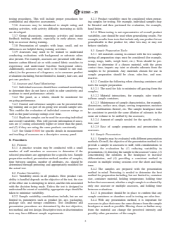SIGNIFICANCE AND USE 5.1 This guide provides general guidelines and recommendations for presenting product and material samples to assessors for evaluation of odor attributes under controlled conditions. Specific situations may require variations to these guidelines. 5.2 This guide is designed for use in assessing odor of products and materials for such applications as, but not limited to, development, reformulation, complaint investigation, quality control, and stability/shelf-life. 5.3 Elements of this guide may also be utilized for assessor training programs involving odor evaluation tasks. SCOPE 1.1 This guide provides guidelines for odor evaluation of products and materials under controlled conditions with a trained panel. 1.2 This guide addresses odor, aroma, malodor and fragrance (see Terminology E253). 1.3 This guide addresses assessor selection and training, sample preparation, and test procedures specific to odor evaluations. 1.4 This guide does not address odor of any specific category of products. 1.5 This guide does not recommend a specific testing method. The user is responsible for identifying the most appropriate test design and analysis tools to address the research questions. 1.6 Units—The values stated in SI units are to be regarded as standard. No other units of measurement are included in this standard. 1.7 This standard does not purport to address all of the safety concerns, if any, associated with its use. It is the responsibility of the user of this standard to establish appropriate safety, health, and environmental practices and determine the applicability of regulatory limitations prior to use. 1.8 This international standard was developed in accordance with internationally recognized principles on standardization established in the Decision on Principles for the Development of International Standards, Guides and Recommendations issued by the World Trade Organization Technical Barriers to Trade (TBT) Committee.