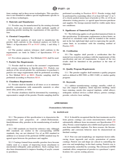 ABSTRACT This specification covers the requirements for cobalt-28chromium-6molybdenum alloy powders for coating of orthopedic implants. This specification covers powder requirements only and does not address coating properties. Materials may be manufactured by rotating electrode process, inert gas atomization, or other methods that meet the powder requirements of this specification. The powder shall conform to chemical composition, sieve analysis, and cleanliness requirements of this specification. SCOPE 1.1 This specification covers the requirements for cobalt-28chromium-6molybdenum alloy powders for use in fabricating cobalt-28chromium-6molybdenum alloy medical devices. 1.2 Powders covered under this specification may be used to form coatings by sintering or thermal spraying techniques, or in metal injection molding or additive manufacturing. 1.3 This specification covers powder requirements only. It does not address properties of the coatings or components formed from them. 1.4 The values stated in either SI units or inch-pound units are to be regarded separately as standard. The values stated in each system are not necessarily exact equivalents; therefore, to ensure conformance with the standard, each system shall be used independently of the other, and values from the two systems shall not be combined. 1.5 This standard does not purport to address all of the safety concerns, if any, associated with its use. It is the responsibility of the user of this standard to establish appropriate safety, health, and environmental practices and determine the applicability of regulatory limitations prior to use. 1.6 This international standard was developed in accordance with internationally recognized principles on standardization established in the Decision on Principles for the Development of International Standards, Guides and Recommendations issued by the World Trade Organization Technical Barriers to Trade (TBT) Committee.