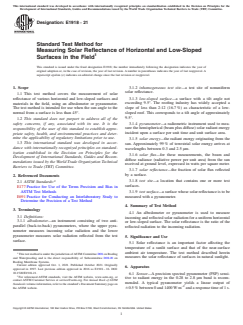 ASTM E1918-21 is a standard published by ASTM International. Its full title is "Standard Test Method for Measuring Solar Reflectance of Horizontal and Low-Sloped Surfaces in the Field". This standard covers: SIGNIFICANCE AND USE 5.1 Solar reflectance is an important factor affecting the temperature of a sunlit surface and that of the near-surface ambient air temperature. The test method described herein measures the solar reflectance of surfaces in natural sunlight. SCOPE 1.1 This test method covers the measurement of solar reflectance of various horizontal and low-sloped surfaces and materials in the field, using an albedometer or pyranometer. The test method is intended for use when the sun angle to the normal from a surface is less than 45°. 1.2 This international standard was developed in accordance with internationally recognized principles on standardization established in the Decision on Principles for the Development of International Standards, Guides and Recommendations issued by the World Trade Organization Technical Barriers to Trade (TBT) Committee.
