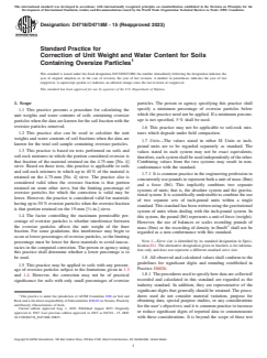 SIGNIFICANCE AND USE 4.1 Compaction tests on soils performed in accordance with Test Methods D698, D1557, D4253, and D7382 place limitations on the maximum size of particles that may be used in the test. If a soil contains cobbles or gravel, or both, test options may be selected which result in particles retained on a specific sieve being discarded (for example the 4.75-mm [No. 4], the 19-mm [3/4-in.] or other appropriate size) and the test performed on the finer fraction. The unit weight-water content relations determined by the tests reflect the characteristics of the actual material tested, and not the characteristics of the total soil material from which the test specimen was obtained. 4.2 It is common engineering practice to use laboratory compaction tests for the design, specification, and construction control of soils used in earth construction. If a soil used in construction contains large particles, and only the finer fraction is used for laboratory tests, some method of correcting the laboratory test results to reflect the characteristics of the total soil is needed. This practice provides a mathematical equation for correcting the unit weight and water content of the finer fraction of a soil, tested to determine the unit weight and water content of the total soil. 4.3 Similarly, as utilized in Test Methods D1556/D1556M, D2167, D6938, D7698, and D7830/D7830M, this practice provides a means for correcting the unit weight and water content of field compacted samples of the total soil, so that values can be compared with those for a laboratory compacted finer fraction. Note 2: The quality of the result produced by this standard is dependent on the competence of the personnel performing it, and the suitability of the equipment and facilities used. Agencies that meet the criteria of Practice D3740 are generally considered capable of competent and objective testing/sampling/inspection/etc. Users of this standard are cautioned that compliance with Practice D3740 does not in i... SCOPE 1.1 This practice presents a procedure for calculating the unit weights and water contents of soils containing oversize particles when the data are known for the soil fraction with the oversize particles removed. 1.2 This practice also can be used to calculate the unit weights and water contents of soil fractions when the data are known for the total soil sample containing oversize particles. 1.3 This practice is based on tests performed on soils and soil-rock mixtures in which the portion considered oversize is that fraction of the material retained on the 4.75-mm [No. 4] sieve. Based on these tests, this practice is applicable to soils and soil-rock mixtures in which up to 40 % of the material is retained on the 4.75-mm [No. 4] sieve. The practice also is considered valid when the oversize fraction is that portion retained on some other sieve, but the limiting percentage of oversize particles for which the correction is valid may be lower. However, the practice is considered valid for materials having up to 30 % oversize particles when the oversize fraction is that portion retained on the 19-mm [3/4-in.] sieve. 1.4 The factor controlling the maximum permissible percentage of oversize particles is whether interference between the oversize particles affects the unit weight of the finer fraction. For some gradations, this interference may begin to occur at lower percentages of oversize particles, so the limiting percentage must be lower for these materials to avoid inaccuracies in the computed correction. The person or agency using this practice shall determine whether a lower percentage is to be used. 1.5 This practice may be applied to soils with any percentage of oversize particles subject to the limitations given in 1.3 and 1.4. However, the correction may not be of practical significance for soils with only small percentages of oversize particles. The person or agency specifying this practice shall specif...