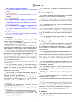 SIGNIFICANCE AND USE 5.1 There are no reproducible standardized protocols for preparing specimens used to evaluate the microbicidal efficacy of non-chemical treatments such as ultraviolet (UV), highenergy electron beam, or other forms of non-chemical antimicrobial technologies. 5.2 Conventional protocols for applying bioburdens to carriers (see Test Method E2197) cause cells to stack upon one another, thereby creating multiple cell layers in which cells in layers closer to the carrier are masked by cells in overlying layers, which makes relative comparison of different non-chemical antimicrobial treatments more difficult. 5.3 Steel and other metal carriers have asperities that can shield a percentage of the applied cells from direct exposure to electromagnetic irradiation. 5.4 The combined effects of 5.2 and 5.3 confound determination of the microbicidal effect of electromagnetic irradiation on test specimens. 5.5 The practice addresses these two confounding factors by: 5.5.1 Using glass microscope slides – the surfaces of which are asperity-free – as carriers. 5.5.2 Reliably depositing bacterial cells onto the carrier as a monolayer. 5.6 The resulting specimen ensures that all microbes deposited onto the carrier are exposed equally to the irradiation source thereby ensuring that the only variables are the controlled ones – starting inoculum concentration, wavelength (λ – in nm), exposure time(s), and resulting energy dose (J). SCOPE 1.1 This practice provides a protocol for creating bacterial cell monolayers on a flat surface. 1.2 The cultures used and culture preparation steps in this Practice are similar to AOAC Method 961.02 and US EPA MB-06. However, test bacteria are applied to the carrier using an automated deposition device (6.2) rather than as a suspension droplet. 1.3 The carrier inspection protocol is similar to US EPA MB-03 except that carrier surfaces are inspected microscopically rather than visually, unaided. 1.4 A monolayer of cells eliminates the confounding effect caused by the shadowing effect of outer layers of bacteria stacked upon other bacteria on test specimens – thereby attenuating directed energy beams (that is, ultraviolet light, high-energy electron beams) before they can reach underlying cells. 1.5 An asperity-free surface eliminates the shadowing effect of specimen surface topology that can block direct exposure of target bacteria to non-chemical antimicrobial treatments. 1.6 This practice provides a reproducible target microbe and surface specimen to minimize specimen variability within and between testing facilities. This facilitates direct data comparisons among various non-chemical antimicrobial technologies. 1.6.1 Antimicrobial pesticides used in clinical and industrial applications are expected to overcome shadowing effects. However, this practice meets a need for a protocol that facilitates relative comparisons among non-chemical antimicrobial treatments. 1.6.2 This practice is not intended to satisfy or replace existing test requirements for liquid chemical antimicrobial treatments (for example Test Methods E1153 and E2197) or established regulatory agency performance standards such as US EPA MB-06. 1.7 This practice was validated using Staphylococcus aureus (ATCC 6538) and Pseudomonas aeruginosa (ATCC 15442) using a protocol based on AOAC Method 961.02. If other cultures are used, the suitability of this practice must be confirmed by inspecting prepared surfaces, by using scanning electron microscopy (SEM) or comparable high-resolution microscopy. 1.8 The specimens prepared in accordance with this practice are not meant to simulate end-use conditions. 1.8.1 Non-chemical technologies are only to be used on visibly clean, non-porous surfaces. Consequently, a soil load is not used. 1.9 Units—The values stated in SI units are to be regarded as standard. No other units of measurement are included in this standard. 1.10 Th...