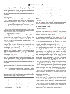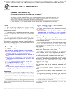 ASTM F2957-13(2019)e1 is a technical specification published by ASTM International. Its full title is "Standard Specification for Ornamental Aluminum Fence Systems". This standard covers: ABSTRACT This specification establishes the minimum requirements for architecturally coated, tubular picket, ornamental aluminum fence systems, namely, aluminum wrought iron fence, architectural metal fence, ornamental aluminum fence, ornamental fence, ornamental metal fence, picket fence, tubular picket fence, and vertical tube fence. The standard covers materials and their manufacture, structural testing, physical dimensions of the fence systems, workmanship, testing of surface finish, and certification. SCOPE 1.1 This specification establishes the minimum requirements for architecturally coated, tubular picket, ornamental aluminum fence systems. 1.2 The values stated in inch-pound units are to be regarded as standard. No other units of measurement are included in this standard. 1.3 This international standard was developed in accordance with internationally recognized principles on standardization established in the Decision on Principles for the Development of International Standards, Guides and Recommendations issued by the World Trade Organization Technical Barriers to Trade (TBT) Committee.