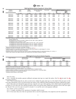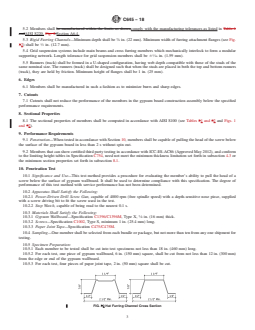 ABSTRACT This specification covers nonstructural steel framing members in interior construction assemblies. Members shall be manufactured from steel and shall have a protective coating. Studs and rigid furring channels shall have a configuration and steel thickness such that the system in which they are used will carry the design transverse loads without exceeding either the allowable stress of the steel or the allowable design deflection. Members shall be manufactured in such a fashion as to minimize burrs and sharp edges. Penetration test shall be done for performance requirements, where members shall be capable of pulling the head of the screw below the surface of the gypsum board without spin out. Apparatus and materials shall satisfy the testing requirements of the specification. SCOPE 1.1 This specification covers nonstructural steel framing members in interior construction assemblies. 1.2 The values stated in inch-pound units are to be regarded as standard. The values given in parentheses are mathematical conversions to SI units that are provided for information only and are not considered standard. 1.3 The following safety hazards caveat pertains only to the test methods portion, Sections 9 and 10, of this specification: This standard does not purport to address all of the safety concerns, if any, associated with its use. It is the responsibility of the user of this standard to establish appropriate safety, health, and environmental practices and determine the applicability of regulatory limitations prior to use. 1.4 This international standard was developed in accordance with internationally recognized principles on standardization established in the Decision on Principles for the Development of International Standards, Guides and Recommendations issued by the World Trade Organization Technical Barriers to Trade (TBT) Committee.