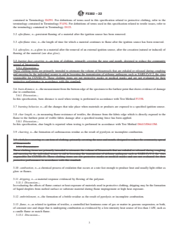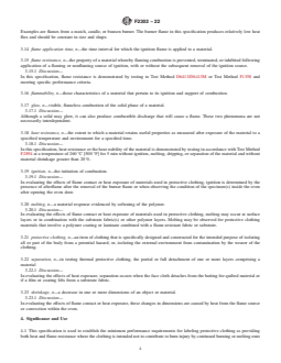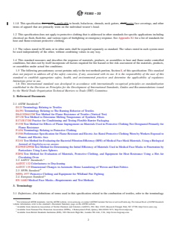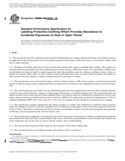 SCOPE 1.1 This specification provides minimum requirements for labeling protective clothing offering heat, flame, and melting resistance for applications where the potential exists for incidental exposure to open flame, radiant heat sources, or hot surfaces which could melt or ignite materials. 1.1.1 Examples of possible applications for this specification include safety apparel, including high-visibility safety apparel, in situations where the possibility exists for accidental contact with hot surfaces, radiant heat sources, or an open flame; clothing worn by individuals for chemical, liquid, or particle protection where the possibility exists for clothing to similarly contact a burner or similar low-intensity flame source; or other clothing worn by individuals that comes in contact with torch flames, hot piping, or other surfaces that melt, degrade, or ignite clothing materials by proximity or contact. 1.1.2 This specification is not to be used for separate claims for flame resistance (“FR”), heat resistance, or protection against the transfer of thermal energy. Instead, clothing materials are required to be evaluated for the combination of flame and heat resistance tests. 1.1.3 This specification does not include a test for establishing protection levels against specific hazards where clothing insulation is needed such as from flash fires, exposure to high-energy electrical arc, or extended duration fires. This specification does not replace and shall not be used in lieu of existing standards where well-defined criteria are established for protection of workers from known characterized intense thermal hazards such as flash fires (NFPA 2112), high-energy electrical arc (Specification F1506), or wildland firefighting (NFPA 1977). See Appendix X1 for a list of standards for heat and flame-resistant protective clothing. 1.1.4 This specification includes requirements that define resistance to melting and combustion of materials used in personal protective clothing in a manner to limit the contribution of the clothing for causing injury to the wearer when exposed to low levels of heat or flame. The primary mechanisms by which a garment can contribute to injury are by the garment igniting and supporting combustion, and if the garment melts onto the wearer’s skin. 1.1.5 This specification is applicable to all materials used in the construction of the protective clothing, including lining materials and materials that contact the skin or underclothing of the wearer. Exclusions are permitted for some materials such as labels and small components that do not come in contact with the wearer’s skin or underclothing. 1.1.6 This specification does not include testing for the evaluation of the entire clothing item. 1.1.7 This specification does not include procedures for testing of gloves or footwear. 1.1.8 This specification is applicable to hoods, balaclavas, shrouds, neck gaiters, barrier face coverings, and other items of apparel that are primarily worn on the individual wearer’s head. 1.2 This specification does not apply to protective clothing that is addressed in other standards for specific applications including electrical arc flash, flash fire, and various types of firefighting or emergency response. See Appendix X1 for a list of standards for heat and flame-resistant protective clothing. 1.3 The values stated in SI units or in other units shall be regarded separately as standard. The values stated in each system must be used independently of the other, without combining values in any way. 1.4 This standard measures and describes the response of materials, products, or assemblies to heat and flame under controlled conditions, but does not by itself incorporate all factors required for fire hazard or fire risk assessment of the materials, products, or assemblies under actual fire conditions. 1.5 The following precautionary caveat pertains only to the test methods portion, Section 8, of...