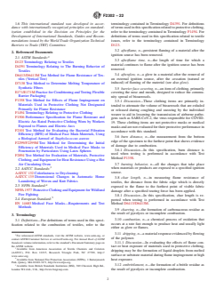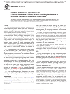 ASTM F2302-22 is a technical specification published by ASTM International. Its full title is "Standard Performance Specification for Labeling Protective Clothing Which Provides Resistance to Incidental Exposures to Heat or Open Flame". This standard covers: SCOPE 1.1 This specification provides minimum requirements for labeling protective clothing offering heat, flame, and melting resistance for applications where the potential exists for incidental exposure to open flame, radiant heat sources, or hot surfaces which could melt or ignite materials. 1.1.1 Examples of possible applications for this specification include safety apparel, including high-visibility safety apparel, in situations where the possibility exists for accidental contact with hot surfaces, radiant heat sources, or an open flame; clothing worn by individuals for chemical, liquid, or particle protection where the possibility exists for clothing to similarly contact a burner or similar low-intensity flame source; or other clothing worn by individuals that comes in contact with torch flames, hot piping, or other surfaces that melt, degrade, or ignite clothing materials by proximity or contact. 1.1.2 This specification is not to be used for separate claims for flame resistance (“FR”), heat resistance, or protection against the transfer of thermal energy. Instead, clothing materials are required to be evaluated for the combination of flame and heat resistance tests. 1.1.3 This specification does not include a test for establishing protection levels against specific hazards where clothing insulation is needed such as from flash fires, exposure to high-energy electrical arc, or extended duration fires. This specification does not replace and shall not be used in lieu of existing standards where well-defined criteria are established for protection of workers from known characterized intense thermal hazards such as flash fires (NFPA 2112), high-energy electrical arc (Specification F1506), or wildland firefighting (NFPA 1977). See Appendix X1 for a list of standards for heat and flame-resistant protective clothing. 1.1.4 This specification includes requirements that define resistance to melting and combustion of materials used in personal protective clothing in a manner to limit the contribution of the clothing for causing injury to the wearer when exposed to low levels of heat or flame. The primary mechanisms by which a garment can contribute to injury are by the garment igniting and supporting combustion, and if the garment melts onto the wearer’s skin. 1.1.5 This specification is applicable to all materials used in the construction of the protective clothing, including lining materials and materials that contact the skin or underclothing of the wearer. Exclusions are permitted for some materials such as labels and small components that do not come in contact with the wearer’s skin or underclothing. 1.1.6 This specification does not include testing for the evaluation of the entire clothing item. 1.1.7 This specification does not include procedures for testing of gloves or footwear. 1.1.8 This specification is applicable to hoods, balaclavas, shrouds, neck gaiters, barrier face coverings, and other items of apparel that are primarily worn on the individual wearer’s head. 1.2 This specification does not apply to protective clothing that is addressed in other standards for specific applications including electrical arc flash, flash fire, and various types of firefighting or emergency response. See Appendix X1 for a list of standards for heat and flame-resistant protective clothing. 1.3 The values stated in SI units or in other units shall be regarded separately as standard. The values stated in each system must be used independently of the other, without combining values in any way. 1.4 This standard measures and describes the response of materials, products, or assemblies to heat and flame under controlled conditions, but does not by itself incorporate all factors required for fire hazard or fire risk assessment of the materials, products, or assemblies under actual fire conditions. 1.5 The following precautionary caveat pertains only to the test methods portion, Section 8, of...