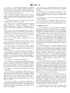 1.1.4 This specification includes requirements that define resistance to melting and combustion of materials used in personal protective clothing in a manner to limit the contribution of the clothing for causing injury to the wearer when exposed to low levels of heat or flame. The primary mechanisms by which a garment can contribute to injury are by the garment igniting and supporting combustion, and if the garment melts onto the wearer’s skin.