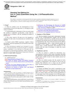 Keywords: ASTM E394-22, trace iron analysis, 1,10-phenanthroline method, spectrophotometric determination of iron, iron quantification, laboratory quality control, precision measurement, industrial chemical analysis.