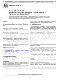 ASTM D3349-21 is a standard published by ASTM International. Its full title is "Standard Test Method for Absorption Coefficient of Ethylene Polymer Material Pigmented with Carbon Black". This standard covers: SIGNIFICANCE AND USE 4.1 The absorption coefficient of polyolefin polymer pigmented with carbon black is useful to judge the degree and uniformity of dispersion of the pigment, and the adequacy of the quantitative level of pigment addition. These factors are used to predict the performance of the polymer material in response to prolonged exposure to ultraviolet light as evidenced by minimal changes in specific properties. Note 1: This test method was developed to evaluate ethylene polymer materials pigmented with small particle size carbon blacks suitable for UV protection. It is not known how accurate and reproducible the test would be with larger (35 nm or greater) particle size blacks. However, for larger particle sizes of carbon black, such as furnace black at 275 nm, when there is at least 5 or higher percent of carbon black, the material pigmented as such has suitable UV protection. SCOPE 1.1 This test method measures the amount of light transmitted through a film of carbon black pigmented ethylene polymer. 1.2 After calculation of the amount of light and film thickness, an absorption coefficient is calculated. 1.3 Whenever two sets of values are presented, in different units, the values in the first set are the standard, while those in parentheses are for information only. 1.4 This standard does not purport to address all of the safety concerns, if any, associated with its use. It is the responsibility of the user of this standard to establish appropriate safety, health, and environmental practices and determine the applicability of regulatory limitations prior to use. 1.5 This international standard was developed in accordance with internationally recognized principles on standardization established in the Decision on Principles for the Development of International Standards, Guides and Recommendations issued by the World Trade Organization Technical Barriers to Trade (TBT) Committee.