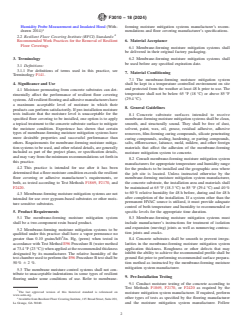 SIGNIFICANCE AND USE 4.1 Moisture permeating from concrete substrates can detrimentally affect the performance of resilient floor covering systems. All resilient flooring and adhesive manufacturers have a maximum acceptable level of moisture in which their products can perform satisfactorily. If pre-installation moisture tests indicate that the moisture level is unacceptable for the specified floor covering to be installed, one option is to apply a topical treatment to the concrete substrate surface to mitigate the moisture condition. Experience has shown that certain types of membrane-forming moisture mitigation systems have more desirable properties and successful performance than others. Requirements for membrane-forming moisture mitigation systems to be used, and other related details, are generally included as part of the project plans, or specification details, and may vary from the minimum recommendations set forth in this practice. 4.2 This practice is intended for use after it has been determined that a floor moisture condition exceeds the resilient floor covering or adhesive manufacturer’s requirements, or both, as tested according to Test Methods F1869, F2170, and F2420. 4.3 Membrane-forming moisture mitigation systems are not intended for use over gypsum-based substrates or other moisture sensitive substrates. SCOPE 1.1 This practice covers the properties, application, and performance of a two-component resin based membrane-forming moisture mitigation system to high moisture concrete substrates prior to the installation of resilient flooring. 1.2 This practice includes recommendations for the preparation of the concrete surface to receive a two-component resin based membrane-forming moisture mitigation system. 1.3 This practice does not supersede written instructions of the two-component resin based membrane-forming moisture mitigation system manufacturer, the resilient flooring manufacturer, underlayment manufacturer, the adhesive manufacturer, or other components of the finish flooring system, or combinations thereof. Users of this practice shall review manufacturer’s technical data sheets and installation instructions for compatibility of system components. 1.4 The following membrane-forming or non membrane-forming moisture mitigation systems are not included in the scope of this practice: 1.4.1 Moisture mitigation systems that chemically react with any constituent of the concrete to form a gel or crystalline substance within the concrete. 1.4.2 Penetrating, water- or solvent-based compounds that do not form a continuous membrane on the concrete surface. 1.4.3 Water-based membrane-forming moisture mitigation systems are not included in the scope of this document. 1.5 The values stated in inch-pound units are to be regarded as standard. The values given in parentheses are mathematical conversions to SI units that are provided for information only and are not considered standard. 1.6 This standard does not purport to address all of the safety concerns, if any, associated with its use. It is the responsibility of the user of this standard to establish appropriate safety, health, and environmental practices and determine the applicability of regulatory limitations prior to use. 1.7 This international standard was developed in accordance with internationally recognized principles on standardization established in the Decision on Principles for the Development of International Standards, Guides and Recommendations issued by the World Trade Organization Technical Barriers to Trade (TBT) Committee.