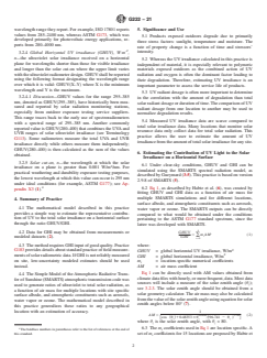 SIGNIFICANCE AND USE 5.1 Products exposed outdoors degrade due to primarily three stress factors: sunlight, temperature and moisture. The rate of property change is a function of time and stressors’ intensity. 5.2 Whereas the UV irradiance calculated in this practice is independent of material, it is especially relevant to polymeric materials exposed outdoors as the combined action of UV radiation and oxygen is often the dominant factor leading to their degradation. Therefore, estimating UV irradiance is an important parameter to assess the service life of products. 5.3 UV radiant dosage is often more important to determine in the correlation with the amount of degradation than total solar radiant dosage or duration of time. The comparison of UV radiant dosage from one location to another may be used to normalize degradation results. 5.4 Measured UV irradiance data are scarce compared to total solar irradiance data. Many locations that monitor solar resource data only collect data for total solar radiation. This practice allows the user to estimate the amount of UV irradiance from the amount of total solar irradiance for any site. SCOPE 1.1 This practice describes methods to estimate the total solar ultraviolet irradiance on a horizontal surface as a function of Air Mass and geographic location. 1.2 This practice provides a mathematical model for calculating Global Horizontal Ultraviolet irradiance (GHUV) from Global Horizontal Irradiance (GHI) data for a specific location. 1.3 Units—The values stated in SI units are to be regarded as standard. No other units of measurement are included in this standard. 1.4 This standard does not purport to address all of the safety concerns, if any, associated with its use. It is the responsibility of the user of this standard to establish appropriate safety, health, and environmental practices and determine the applicability of regulatory limitations prior to use. 1.5 This international standard was developed in accordance with internationally recognized principles on standardization established in the Decision on Principles for the Development of International Standards, Guides and Recommendations issued by the World Trade Organization Technical Barriers to Trade (TBT) Committee.