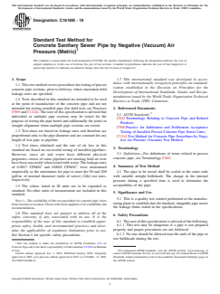 ASTM C1618M-19: Standard Test Method for Concrete Sanitary Sewer Pipe by Negative (Vacuum) Air Pressure (Metric) defines procedures for testing precast concrete sanitary sewer pipe sections using negative (vacuum) or positive air pressure methods. The standard, developed by ASTM, aims to ensure manufactured concrete pipes meet specified leakage limits and conform to quality control requirements before delivery and installation. This test method is relevant for manufacturers, quality control laboratories, and project engineers involved in sewer infrastructure projects where pipe integrity and watertightness are critical.