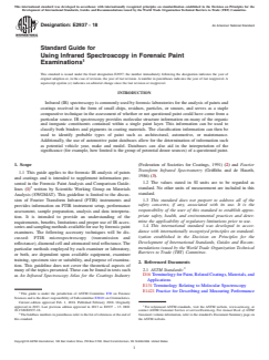 ASTM E2937-18 is a guide published by ASTM International. Its full title is "Standard Guide for Using Infrared Spectroscopy in Forensic Paint Examinations". This standard covers: SIGNIFICANCE AND USE 5.1 FTIR spectroscopy can be employed for the classification of paint binder types and pigments as well as for the comparison of spectra from known and questioned coatings. When used for comparison purposes, the goal of the forensic examiner is to determine whether any meaningful differences exist between the known and questioned samples. 5.2 This guide is designed to assist an examiner in the selection of appropriate sample preparation methods and instrumental parameters for the analysis, comparison or identification of paint binders and pigments. 5.3 It is not the intent of this guide to present comprehensive theories and methods of FTIR spectroscopy. It is necessary that the examiner have an understanding of FTIR and general concepts of specimen preparation prior to using this guide. This information is available from manufacturers’ reference materials, training courses, and references such as: Forensic Applications of Infrared Spectroscopy (Suzuki, 1993) (4), Infrared Microspectroscopy of Forensic Paint Evidence (Ryland, 1995) (5), Use of Infrared Spectroscopy for the Characterization of Paint Fragments (Beveridge, 2001) (6), and An Infrared Spectroscopy Atlas for the Coatings Industry (2). SCOPE 1.1 This guide applies to the forensic IR analysis of paints and coatings and is intended to supplement information presented in the Forensic Paint Analysis and Comparison Guidelines (1)2 written by Scientific Working Group on Materials Analysis (SWGMAT). This guideline is limited to the discussion of Fourier Transform Infrared (FTIR) instruments and provides information on FTIR instrument setup, performance assessment, sample preparation, analysis and data interpretation. It is intended to provide an understanding of the requirements, benefits, limitations and proper use of IR accessories and sampling methods available for use by forensic paint examiners. The following accessory techniques will be discussed: FTIR microspectroscopy (transmission and reflectance), diamond cell and attenuated total reflectance. The particular methods employed by each examiner or laboratory, or both, are dependent upon available equipment, examiner training, specimen size or suitability, and purpose of examination. This guideline does not cover the theoretical aspects of many of the topics presented. These can be found in texts such as An Infrared Spectroscopy Atlas for the Coatings Industry (Federation of Societies for Coatings, 1991) (2) and Fourier Transform Infrared Spectrometry (Griffiths and de Haseth, 1986) (3). 1.2 The values stated in SI units are to be regarded as standard. No other units of measurement are included in this standard. 1.3 This standard does not purport to address all of the safety concerns, if any, associated with its use. It is the responsibility of the user of this standard to establish appropriate safety, health, and environmental practices and determine the applicability of regulatory limitations prior to use. 1.4 This international standard was developed in accordance with internationally recognized principles on standardization established in the Decision on Principles for the Development of International Standards, Guides and Recommendations issued by the World Trade Organization Technical Barriers to Trade (TBT) Committee.