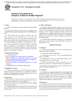 ASTM D715-86(2020): Standard Test Methods for Analysis of Barium Sulfate Pigment outlines standardized procedures for determining the purity of barium sulfate pigment and quantifying known impurities. Developed by ASTM International under the D01 Committee on Paint and Related Coatings, this standard ensures reliable analysis needed by both pigment manufacturers and end-users, particularly in the coatings industry. The methods address a range of analytical requirements, ensuring that barium sulfate pigment meets industry quality benchmarks, which is essential for performance in coatings and related applications.