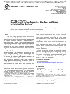 ASTM D2200-17(2021) is a standard published by ASTM International. Its full title is "Standard Practice for Use of Pictorial Surface Preparation Standards and Guides for Painting Steel Surfaces". This standard covers: SIGNIFICANCE AND USE 4.1 The appearance of the various degrees of dry and wet abrasive blast cleaning, hand and power tool cleaning, and water jetting are influenced by the initial rust grades of the steel being cleaned and/or the type and condition of the coating on the existing steel. The standards and guides aid visually in judging and evaluating the degree of rusting and/or paint deterioration before cleaning and the degree of cleaning of steel surfaces prior to painting. 4.2 Five methods have evolved because of differences in the practice of using visual standards and guides throughout the world, and the method of surface preparation employed. In Europe, the visual standards (Method A) are used as the primary means of assessing the degree of cleaning. In the U.S., the SSPC written definitions take precedence with the visual guides and reference photographs used as a supplement. The visual guides and reference photographs of Methods B, C, and D conform to the SSPC written definitions. There are written definitions for Method E, however, the visual guide for Method E does not contain a complete set of pictorials corresponding to each surface cleanliness definition. SCOPE 1.1 The visual surface preparation guides and standards consist of a series of color prints available as separate publications. Five different sets of photographs are described in this standard, designated as Method A (ISO/Swedish Standard2) and Methods B through E (SSPC Guides and Reference Photographs3). The methods differ in the depiction of the initial surface, in the definition and depiction of the cleaning conditions, and in the number of cleaning methods included. Because of these differences, the specifier should state which guide to use. 1.2 The colored visual surface preparation guides represent different conditions of hot-rolled carbon steel before and after surface preparation. Prior to cleaning, there are four rust grades, A to D, that cover the range from intact mill scale to 100 % rusted and pitted steel. The standards then depict the appearance of the initial conditions after cleaning by one or more methods (for example, dry abrasive blast cleaning) to various degrees of thoroughness. In addition, Method B includes three painted conditions that contain various degrees of deterioration. The Guide3 depicts these conditions after various degrees of dry abrasive blast cleaning. Method C includes four rust grades and three painted conditions that contain various degrees of deterioration. The Guide4 depicts these conditions after various degrees of hand and power tool cleaning. Method D includes two rust grades and four painted conditions that contain various degrees of deterioration. The Guide5 depicts these conditions after various degrees of water jetting, with three levels of flash rusting. Method E includes two rust grades. The Guide6 depicts these conditions after various degrees of wet abrasive blast cleaning, with three levels of flash rusting. 1.3 This international standard was developed in accordance with internationally recognized principles on standardization established in the Decision on Principles for the Development of International Standards, Guides and Recommendations issued by the World Trade Organization Technical Barriers to Trade (TBT) Committee.