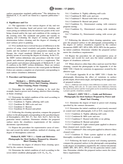 SIGNIFICANCE AND USE 4.1 The appearance of the various degrees of dry and wet abrasive blast cleaning, hand and power tool cleaning, and water jetting are influenced by the initial rust grades of the steel being cleaned and/or the type and condition of the coating on the existing steel. The standards and guides aid visually in judging and evaluating the degree of rusting and/or paint deterioration before cleaning and the degree of cleaning of steel surfaces prior to painting. 4.2 Five methods have evolved because of differences in the practice of using visual standards and guides throughout the world, and the method of surface preparation employed. In Europe, the visual standards (Method A) are used as the primary means of assessing the degree of cleaning. In the U.S., the SSPC written definitions take precedence with the visual guides and reference photographs used as a supplement. The visual guides and reference photographs of Methods B, C, and D conform to the SSPC written definitions. There are written definitions for Method E, however, the visual guide for Method E does not contain a complete set of pictorials corresponding to each surface cleanliness definition. SCOPE 1.1 The visual surface preparation guides and standards consist of a series of color prints available as separate publications. Five different sets of photographs are described in this standard, designated as Method A (ISO/Swedish Standard2) and Methods B through E (SSPC Guides and Reference Photographs3). The methods differ in the depiction of the initial surface, in the definition and depiction of the cleaning conditions, and in the number of cleaning methods included. Because of these differences, the specifier should state which guide to use. 1.2 The colored visual surface preparation guides represent different conditions of hot-rolled carbon steel before and after surface preparation. Prior to cleaning, there are four rust grades, A to D, that cover the range from intact mill scale to 100 % rusted and pitted steel. The standards then depict the appearance of the initial conditions after cleaning by one or more methods (for example, dry abrasive blast cleaning) to various degrees of thoroughness. In addition, Method B includes three painted conditions that contain various degrees of deterioration. The Guide3 depicts these conditions after various degrees of dry abrasive blast cleaning. Method C includes four rust grades and three painted conditions that contain various degrees of deterioration. The Guide4 depicts these conditions after various degrees of hand and power tool cleaning. Method D includes two rust grades and four painted conditions that contain various degrees of deterioration. The Guide5 depicts these conditions after various degrees of water jetting, with three levels of flash rusting. Method E includes two rust grades. The Guide6 depicts these conditions after various degrees of wet abrasive blast cleaning, with three levels of flash rusting. 1.3 This international standard was developed in accordance with internationally recognized principles on standardization established in the Decision on Principles for the Development of International Standards, Guides and Recommendations issued by the World Trade Organization Technical Barriers to Trade (TBT) Committee.