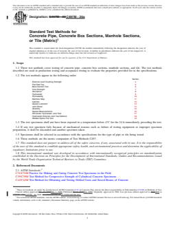ASTM C497M-20a is an international standard issued by ASTM International, specifying test methods for evaluating the quality, performance, and acceptance of concrete pipe, concrete box sections, manhole sections, and tile using metric units. The standard is indispensable for manufacturers, testing laboratories, and construction professionals engaged in the production and quality control of concrete drainage and sewer infrastructure.