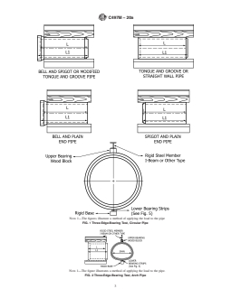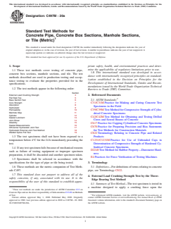 These test methods cover production and acceptance tests for concrete pipes, manhole sections, and tiles. Tests include procedures for evaluating external load crushing strength, flat slab top, core strength, absorption, hydrostatic, permeability, manhole step, cylinder, gasket lubricant, joint shear, alkalinity, and gasket measurements. Aside from the procedures, this standard also details the significance and use of and the required test apparatus for each test.