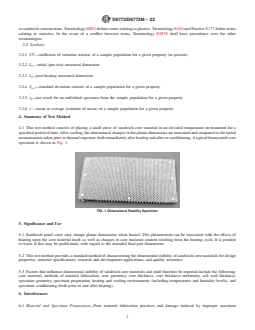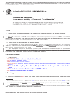 SIGNIFICANCE AND USE 5.1 Sandwich panel cores may change planar dimensions when heated. This phenomenon can be associated with the effects of heating upon the core material itself, as well as changes in core moisture content resulting from the heating cycle. It is prudent to know if this may be problematic with regard to the intended final part dimensions. 5.2 This test method provides a standard method of characterizing the dimensional stability of sandwich core materials for design properties, material specifications, research and development applications, and quality assurance. 5.3 Factors that influence dimensional stability of sandwich core materials and shall therefore be reported include the following: core material, methods of material fabrication, core geometry, core thickness, core thickness uniformity, cell wall thickness, specimen geometry, specimen preparation, heating and cooling environments (including temperatures and humidity levels), and specimen conditioning (both prior to and after heating). SCOPE 1.1 This test method covers the determination of the sandwich core dimensional stability in the two plan dimensions. 1.2 Units—The values stated in either SI units or inch-pound units are to be regarded separately as standard. The values stated in each system are not necessarily exact equivalents; therefore, to ensure conformance with the standard, each system shall be used independently of the other, and values from the two systems shall not be combined. 1.2.1 Within the text, the inch-pound units are shown in brackets. 1.3 This standard does not purport to address all of the safety concerns, if any, associated with its use. It is the responsibility of the user of this standard to establish appropriate safety, health, and environmental practices and determine the applicability of regulatory limitations prior to use. 1.4 This international standard was developed in accordance with internationally recognized principles on standardization established in the Decision on Principles for the Development of International Standards, Guides and Recommendations issued by the World Trade Organization Technical Barriers to Trade (TBT) Committee.