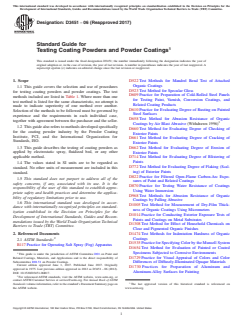 SIGNIFICANCE AND USE 4.1 This guide provides a useful summary to the selection and use of procedures for testing coating powders and powder coatings. It is applicable to both thermoplastic and thermoset coatings, unless indicated otherwise. By design this guide does not purport to address test methods or procedures developed specifically for the functional powder coating market, those coating powders for application to pipe or reinforced steel bars (rebar). Information on current test procedures for pipe and reinforced steel bar coating powders and powder coatings can be obtained through their respective ASTM Subcommittees, A01.05 and D01.48. 4.2 Selection of the methods to be followed and the interpretation of results must be governed by experience and the requirements in each individual case, together with agreement between the purchaser and seller. It should be noted that many of the methods used for characterizing a coating powder, such as gel time (Section 16) and inclined flow (Section 17), are primarily meant for the relative comparison of two coating powders, rather than to give a test value that can be interpreted as good or bad. Interpretation of the test results will depend on the specific application in question and will also often depend on the chemistry of the coating powder used. SCOPE 1.1 This guide covers the selection and use of procedures for testing coating powders and powder coatings. The test methods included are listed in Table 1. Where more than one test method is listed for the same characteristic, no attempt is made to indicate superiority of one method over another. Selection of the methods to be followed must be governed by experience and the requirements in each individual case, together with agreement between the purchaser and the seller. 1.2 This guide also refers to methods developed specifically for the coating powder industry by the Powder Coating Institute, PCI, and the International Organization for Standards, ISO. 1.3 This guide describes the testing of coating powders as applied by electrostatic spray, fluidized bed, or any other applicable method. 1.4 The values stated in SI units are to be regarded as standard. No other units of measurement are included in this standard. 1.5 This standard does not purport to address all of the safety concerns, if any, associated with its use. It is the responsibility of the user of this standard to establish appropriate safety and health practices and determine the applicability of regulatory limitations prior to use. 1.6 This international standard was developed in accordance with internationally recognized principles on standardization established in the Decision on Principles for the Development of International Standards, Guides and Recommendations issued by the World Trade Organization Technical Barriers to Trade (TBT) Committee.