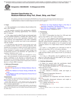 ASTM B654/B654M-10(2018) is a technical specification published by ASTM International. Its full title is "Standard Specification for Niobium-Hafnium Alloy Foil, Sheet, Strip, and Plate". This standard covers: ABSTRACT This specification covers foils, sheets, strips, and plates made from UNS R04295 hafnium alloyed niobium ingots and billets. The materials should be in the annealed condition unless otherwise specified. The materials may also be in a forged, rolled, extruded, swaged, or drawn finish in a cleaned, machined, or ground condition. All the products should be formed with conventional extrusion, forging, and rolling equipment normally used in metal working plants. SCOPE 1.1 This specification covers hafnium alloyed niobium foil, sheet, strip, and plate. 1.2 The material covered by this specification is R04295, niobium-base alloy containing approximately 10 % hafnium and 1 % titanium. 1.3 The values stated in either SI units or inch-pound units are to be regarded separately as standard. The values stated in each system may not be exact equivalents; therefore, each system shall be used independently of the other. Combining values from the two systems may result in non-conformance with the standard. 1.4 The following safety hazards caveat pertains only to the test methods portion, Section 14, of this specification: This standard does not purport to address all of the safety problems, if any, associated with its use. It is the responsibility of the user of this standard to establish appropriate safety, health, and environmental practices and determine the applicability of regulatory limitations prior to use. 1.5 This international standard was developed in accordance with internationally recognized principles on standardization established in the Decision on Principles for the Development of International Standards, Guides and Recommendations issued by the World Trade Organization Technical Barriers to Trade (TBT) Committee.