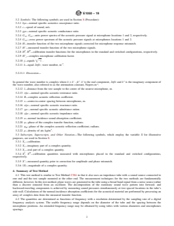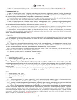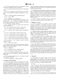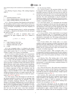 SIGNIFICANCE AND USE 5.1 This test method can be applied to measure sound absorption coefficients of absorptive materials at normal incidence, that is, 0°. It also can be used to determine specific impedance and admittance ratios. The properties measured with this test method are useful in basic research and product development of sound absorptive materials. 5.2 Normal incidence sound absorption coefficients can be quite useful in certain situations where the material is placed within a small acoustical cavity close to a sound source, for example a closely-fitted machine enclosure. 5.3 This test method allows one to compare relative values of sound absorption when it is impractical to procure large samples for accurate random-incidence measurements in a reverberation room. Estimates of the random incidence absorption coefficients can be obtained from normal impedance data for locally-reacting materials (2). Note 2: The classification, “locally-reacting” includes fibrous materials having high internal losses. Formulas have been developed for converting sound absorption properties from normal incidence to random incidence, for both locally-reacting and bulk-reacing materials (3). 5.4 Measurements described in this test method can be made with high precision, but these measurements may be misleading. Uncertainties of greater magnitude than those from the measurements may occur from other sources. Care should be exercised to sample nonuniform materials adequately (see 11.1). SCOPE 1.1 This test method covers the use of an impedance tube, two microphone locations, and a digital frequency analysis system for the determination of normal incidence sound absorption coefficients and normal specific acoustic impedance ratios of materials. 1.2 Laboratory Accreditation—A procedure for accrediting a laboratory for performing this test method is given in Annex A1. 1.3 The values stated in SI units are to be regarded as standard. No other units of measurement are included in this standard. 1.4 This standard does not purport to address all of the safety concerns, if any, associated with its use. It is the responsibility of the user of this standard to establish appropriate safety, health, and environmental practices and determine the applicability of regulatory limitations prior to use. 1.5 This international standard was developed in accordance with internationally recognized principles on standardization established in the Decision on Principles for the Development of International Standards, Guides and Recommendations issued by the World Trade Organization Technical Barriers to Trade (TBT) Committee.