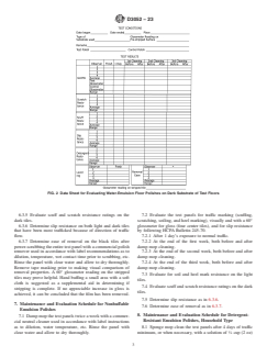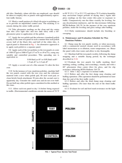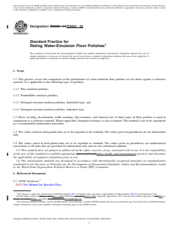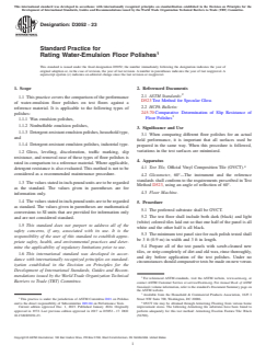SIGNIFICANCE AND USE 3.1 When comparing different floor polishes for an actual field performance, it is important that all surfaces used be prepared in the same way. When this procedure is followed, variations in the test surfaces are minimized. SCOPE 1.1 This practice covers the comparison of the performance of water-emulsion floor polishes on test floors against a reference material. It is applicable to the following types of polishes: 1.1.1 Wax emulsion polishes, 1.1.2 Nonbuffable emulsion polishes, 1.1.3 Detergent-resistant emulsion polishes, household type, and 1.1.4 Detergent-resistant emulsion polishes, industrial type. 1.2 Gloss, leveling, discoloration, traffic marking, slip resistance, and removal ease of these types of floor polishes is rated in comparison to a reference material. Where applicable, detergent resistance is also evaluated. This method is not to be considered as a recommended maintenance procedure. 1.3 The values stated in inch-pound units are to be regarded as the standard. The values given in parentheses are for information only. 1.4 The values stated in inch-pound units are to be regarded as standard. The values given in parentheses are mathematical conversions to SI units that are provided for information only and are not considered standard. 1.5 This standard does not purport to address all of the safety concerns, if any, associated with its use. It is the responsibility of the user of this standard to establish appropriate safety, health, and environmental practices and determine the applicability of regulatory limitations prior to use. 1.6 This international standard was developed in accordance with internationally recognized principles on standardization established in the Decision on Principles for the Development of International Standards, Guides and Recommendations issued by the World Trade Organization Technical Barriers to Trade (TBT) Committee.