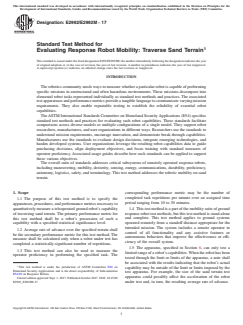 ASTM E2992/E2992M-17: Standard Test Method for Evaluating Response Robot Mobility: Traverse Sand Terrain establishes a quantitative method to assess the ability of teleoperated ground robots to traverse sand terrain. Developed by ASTM International's Committee E54 on Homeland Security Applications, this standard aims to create a repeatable, objective framework for measuring robot mobility in sandy environments based on statistically significant performance metrics. The standard is utilized by manufacturers, researchers, and end users to inform design improvements, benchmark robot capabilities, and guide acquisition and operational decisions for response robots.